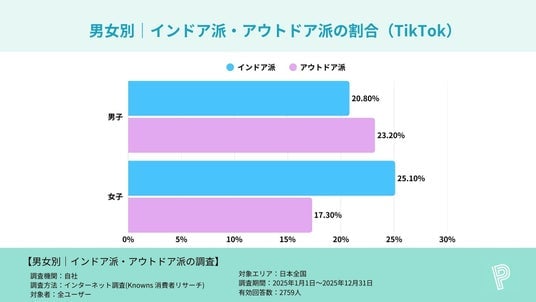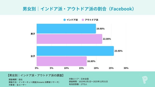 またFacebook(インドア派25.9%)やTikTok(インドア派25.1%)でもインドア派が高水準となっており、女性はSNSアプリにかかわらず落ち着いた行動スタイルが優勢であることが分かりました。