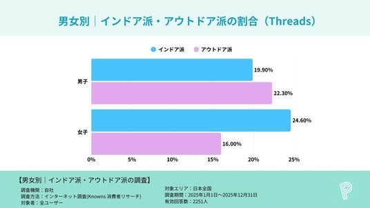 男性に絞って見ると、全アプリでアウトドア派がインドア派を上回る結果となりました。特にInstagramはアウトドア派24.3%と男性の中で最も高いです。TikTok(アウトドア派23.2%)やThreads(アウトドア派22.3%)でもアウトドア派が優勢でした。