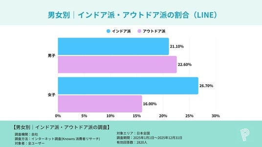 なかでもLINEはインドア派23.7%・アウトドア派19.4%と差が大きく、日常連絡に使われる身近なSNSほど“インドア寄り”の傾向が見られます。一方でInstagram(インドア派22.6%/アウトドア派20.4%)などは差が比較的小さく、アプリごとに生活スタイルの偏りに違いがあることが分かりました。