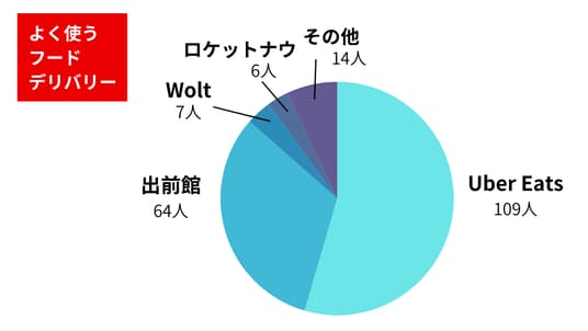 回答者200人のうち、半数以上の109人が「Uber Eats(ウーバーイーツ)」を最もよく利用すると答えました。