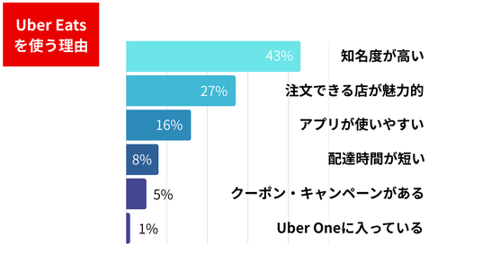 また、Uber Eats は加盟店の数が非常に多くバラエティに富んでいるため、「注文できる店が魅力的」という理由が2位となっている点も納得できます。
