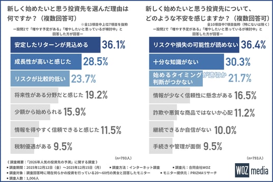 合同会社WOZ(所在地:東京都渋谷区、代表社員:小畑 和彰)は、現在何らかの投資を行っている20~60代の男女を対象に、「2026年人気の投資先の予測」に関する調査を実施しました。