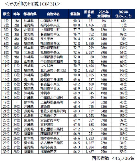 ●その他の地域のトップ2は6年連続で、1位沖縄県中頭郡北谷町、2位福岡県福岡市中央区です。3位は北海道上川郡東川町で、昨年5位から順位を上げました。トップ3の自治体のうち、2つが各道県の郡部に属する「町」という結果になっています。昨年から順位を上げてトップ30入りしたのは、28位愛知県名古屋市千種区(昨年32位)、29位福岡県福岡市南区(昨年37位)です。