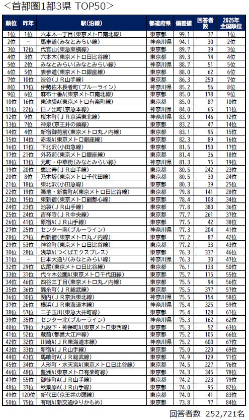 ●首都圏1都3県は、1位は3年連続で、1位は六本木一丁目(東京都)です。2位は初登場の馬車道(神奈川県)で、昨年は累計回答者数が30名未満でランキングの集計対象外でした。3位は代官山(東京都)で、昨年12位から順位を上げました。トップ2の駅は、偏差値90台の極めて高い評価を得ています。