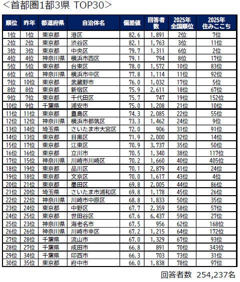 ●首都圏1都3県のトップ3は、1位は6年連続で港区、2位は5年連続で渋谷区、3位は3年連続で中央区で、いずれも東京都23区がランクインしています。トップ30のうち、17自治体が東京都、7自治体が神奈川県の自治体です。昨年から順位を上げてトップ30入りしたのは、29位千葉県印西市(昨年34位)、30位東京都府中市(昨年35位)です。