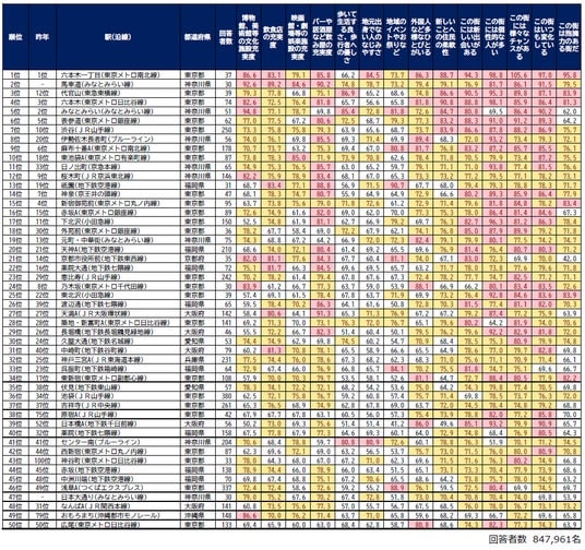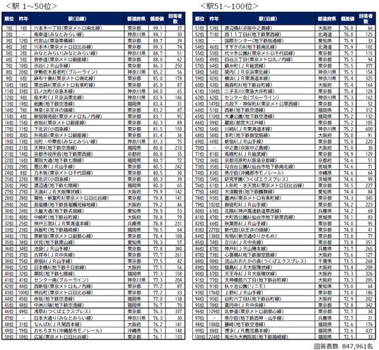 ●トップ100で今回初登場の駅は、47位日本大通り(神奈川県)、53位国際センター(愛知県)、70位中之島(大阪府)、97位県庁前(兵庫県)で、いずれも昨年は累計回答者数が30名未満でランキングの集計対象外でした。