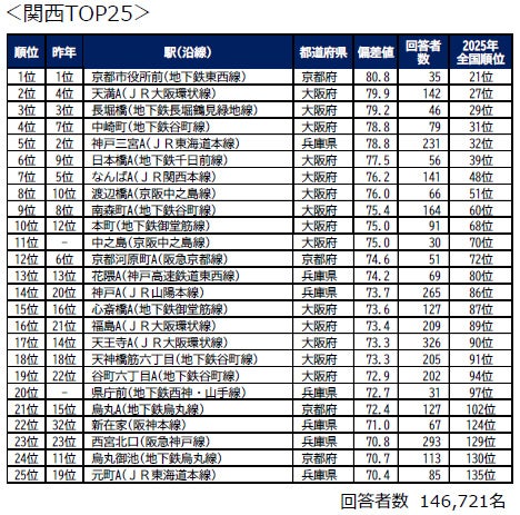 ●関西は、1位は2年連続で京都市役所前(京都府)で、唯一偏差値80台の極めて高い評価を得ています。2位は天満A(扇町・天満の近隣駅を統合)(大阪府)で、昨年4位から順位を上げました。3位は、2年連続で長堀橋(大阪府)です。トップ25の地域別では、大阪府が14駅、次いで兵庫県が7駅ランクインしています。