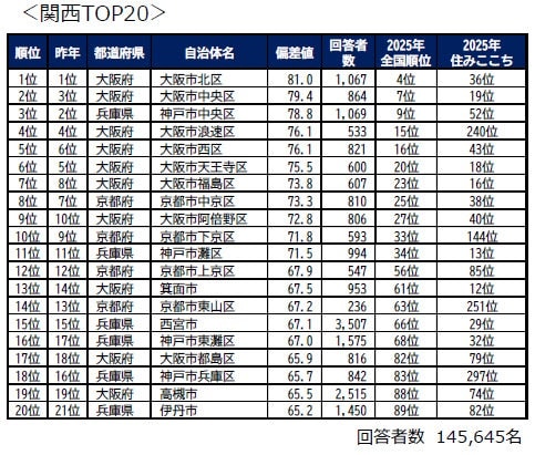 ●関西の1位は、6年連続で大阪府大阪市北区です。2位は昨年3位から一つ順位を上げた大阪府大阪市中央区、3位は兵庫県神戸市中央区です。トップ20には、大阪府が最も多く10自治体、次いで兵庫県が6自治体ランクインしています。