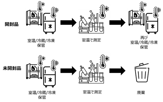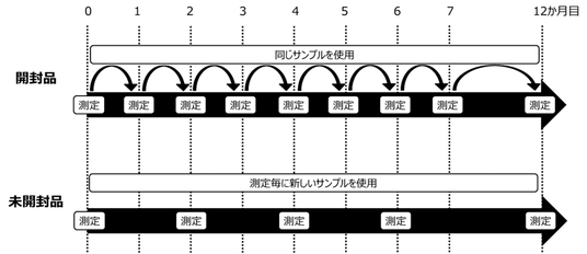 開封品は全て同一のサンプルを用いて測定したため、測定時は室温に置いて測定後はもとの温度帯で保管を再開しました。このように冷蔵や冷凍保管した開封品サンプルは測定の度に室温に置かれ、繰り返される温度変化にさらされた状態で保管されました。一方で未開封品は測定直前まで同じ温度帯で保管され、温度変化のない状態でした。