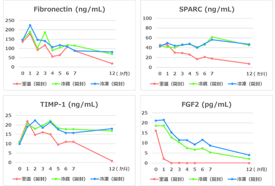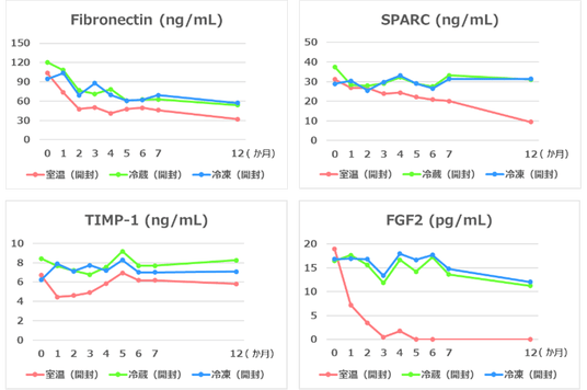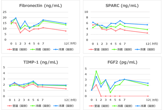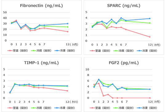 4つのタンパク質すべてで室温保管によるタンパク質の減少が見られました。これまでの結果と同様FGF2において著しく減少し、4か月目以降は0 pg/mL(検出下限以下)となりました。FGF2の次にSPARC、Fibronectin、TIMP-1の順に減少幅が大きく、冷凍保管では減少を抑えられることが確認できました。