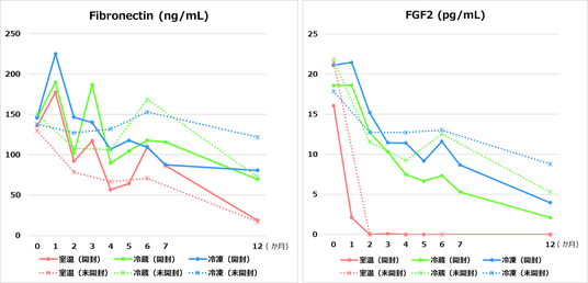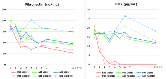 FibronectinおよびFGF2において差が見られました。いずれも室温保管の場合は開封品と未開封品で大きな差はないものの、冷蔵と冷凍保管で差がみられました。FGF2ではおおよそ4か月目までは同程度であったのに対し、Fibronectinにおいては2か月目から開封品の減少がみられました。開封品は測定のたびに室温にさらされ、繰り返される温度変化によってタンパク質の分解や失活が進行しやすくなった可能性が考えられます。