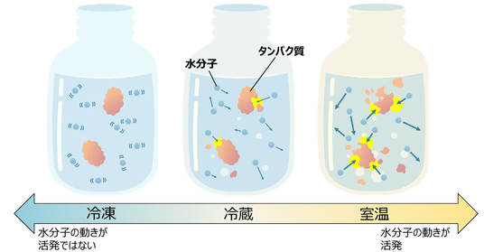 一般的に幹細胞コスメの主要成分となるタンパク質は熱に弱く、室温下では分解や失活が進行しやすいことが知られています。これは、温度上昇により幹細胞コスメ中の水分子の運動が活発になり、タンパク質構造の安定性が低下することが一因と考えられます。一方、低温環境では水分子の運動が抑制され、タンパク質の安定性が保たれやすくなります。この特性を把握した上で、当社は冷凍便でお届けし、冷蔵保管を推奨しています。