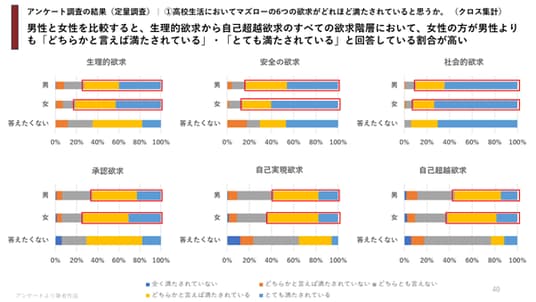 アンケート調査の結果、「生理的欲求」「安全の欲求」「社会的欲求」はすでに満たされている一方、「承認欲求」「自己実現欲求」「自己超越欲求」を今後満たしたいと考えていることが判明しました。約30%の高校生が「自己実現欲求」を今後最も満たしたいと回答し、約20%が「自己超越欲求」を選択しています。マズローの欲求階層は逆転しており、より高次の欲求から満たしたいと志向していることが明らかになりました。