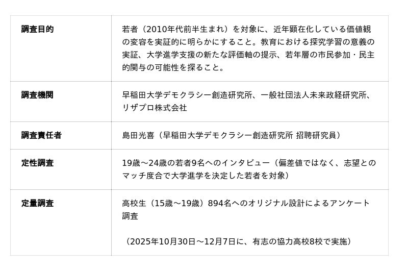 しかし、こうした若者の価値観変容はこれまで感覚的・印象的に語られることが多く、定量・定性の両面から実証的に検証した研究は限られていました。今回の調査は、この空白を埋めるべく、早稲田大学デモクラシー創造研究所、未来政経研究所、リザプロ株式会社の3者が共同で取り組んだものです。