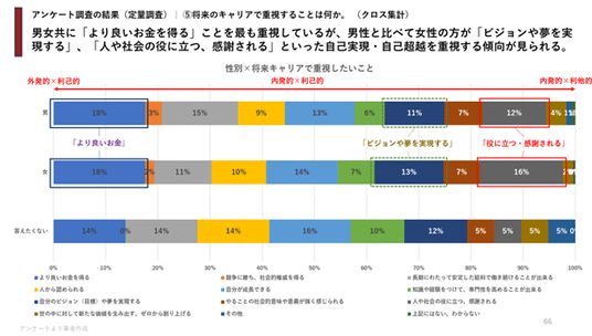 一方、アンケート調査では、生活のための「所得」や「雇用の安定」など外発的な価値観が最重要視されており、それらを前提として「自己成長」や「ビジョンや夢の実現」が重視される傾向が見られました。定量的には、外発的な価値観よりも内発的な価値観を重視しているとは言い切れない結果となっています。