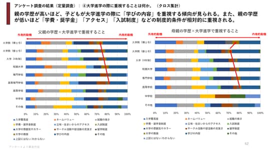 ● 親の学歴が高いほど、子どもが大学進学の際に「学びの内容」を重視し、親の学歴が低いほど「学費・奨学金」「アクセス」「入試制度」などの制度的条件が重視される