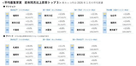 <2026年1月 全国主要都市における賃貸マンション・アパートの平均家賃(面積帯別)>
