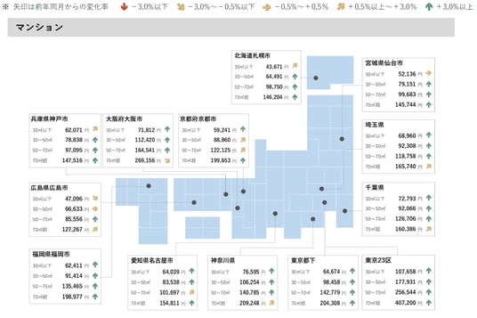 ●マンションは、ファミリー向きが5カ月連続して全13エリアで前年同月を上回る。シングル向きでは東京23区が20カ月連続、大阪市が18カ月連続で2015年1月以降最高値を更新し、東京23区は7カ月連続で全面積帯において最高値となった。