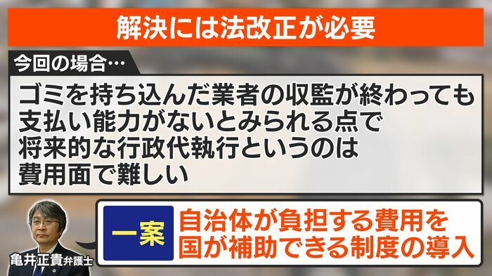 亀井正貴弁護士によると、今回の場合、ゴミを持ち込んだ業者の収監が終わっても支払い能力がないとみられる点で、将来的な行政代執行というのは費用面で難しいといいます。