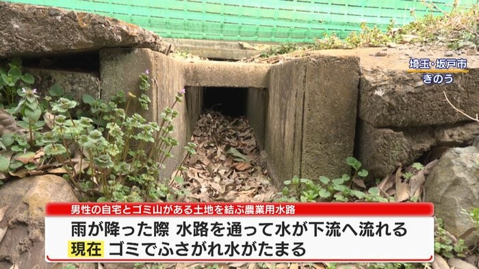 男性の自宅から、ゴミの山がある土地へと伸びる農業用水路。雨が降った際、この水路を通って水が下流へ流れていくようになっていましたが、現在はゴミでふさがれ、この場所に水が溜まってしまうといいます。
