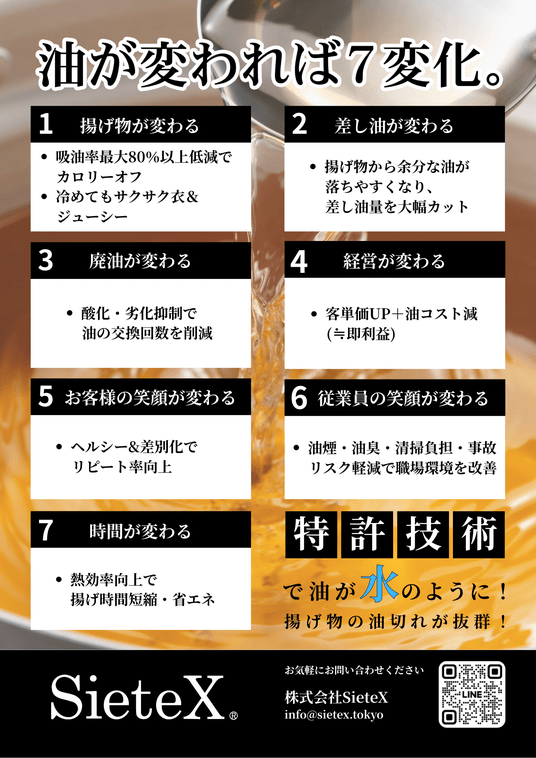 健康意識の高まりは一過性ではなく、日常の選択基準として定着しつつあります。油の品質への取り組みは、店舗の清潔感や信頼にも直結し、早期に差別化できた店舗ほど長期的な支持につながります。SieteXの導入は、その差別化と品質づくりを現場で無理なく実現する最適なソリューションです。