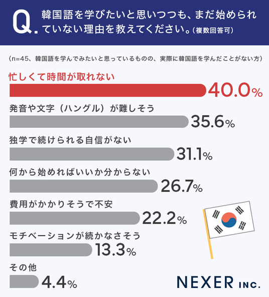 もっとも多かったのは「忙しくて時間が取れない」で40.0%でした。次いで「発音や文字(ハングル)が難しそう」が35.6%、「独学で続けられる自信がない」が31.1%と続きます。