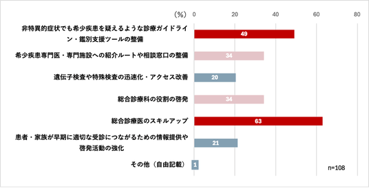 希少疾患の早期診断を進めるうえで必要だと感じる支援として、「総合診療医のスキルアップ」(63%)、「鑑別支援ツール・ガイドラインの整備」(49%)が上位に挙げられました。これらの結果から、希少疾患診断においては、医師個人の努力や経験に依存するだけでは解決が難しく、知識や判断を支える仕組みを整備することも重要であると、総合診療医自身が認識していることがうかがえます。
