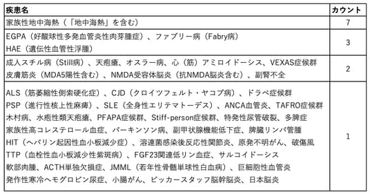 Q. 前問で「複数例/年」「1例/年」「1例未満/年」とお答えした先生へ、診断に関わった希少疾患名をご記入ください。(自由記入)
