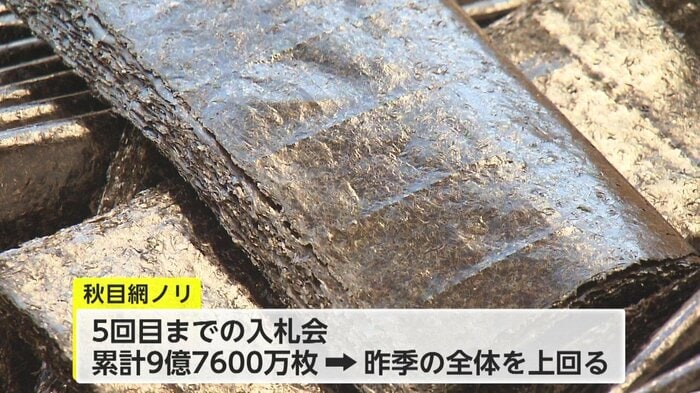 今シーズン前半の養殖ノリは、秋芽網ノリの色落ちはなく好調な滑り出しだった。5回目の入札会までの累計枚数は約9億7600万枚にのぼり、この時点で昨シーズン全体をすでに上回っていた。