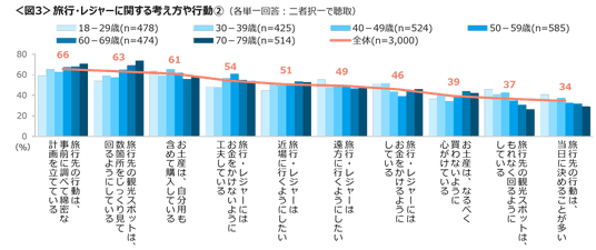 二者択一で確認した考え方や行動では、「旅行先の行動は、事前に調べて綿密な計画を立てている」が66%、「旅行先の観光スポットは、数箇所をじっくり見て回るようにしている」63%、「お土産は、自分用も含めて購入している」61%がTOP3。18~29歳と30代は「旅行・レジャーにはお金をかけるようにしている」、加えて18~29歳では「旅行・レジャーは遠方に行くようにしたい」「旅行先の観光スポットは、もれなく回るようにしている」「旅行先の行動は、当日に決めることが多い」が他年代より高い。<図3>
