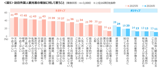 訪日外国人については、「文化遺産への落書きはやめてほしい」「路上飲み、禁煙場所での喫煙、ごみのポイ捨てはやめてほしい」「無許可での写真撮影や私有地の立ち入りをやめてほしい」「訪日外国人観光客で混雑している観光地へは行きにくい」が4割とネガティブなイメージが昨年同様に高い結果であった。<図5>