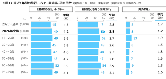 株式会社クロス・マーケティング(本社:東京都新宿区、代表取締役社長:五十嵐 幹)は、2026年2月、全国18~79歳の男女3,000名を対象に「旅行に関する実態・意識調査(2026年2月定点ココロスタイルリサーチ)」を行いました。本調査は、生活者の意識やライフスタイルの変化の兆しを捉えることを目的として、定点で実態・意識調査を実施するものです。今回は旅行編として、直近1年間の旅行の実施と回数、旅行・レジャーに関する考え方や行動、訪れたい場所、訪日外国人観光客の増加により思うことを中心に分析をしました。