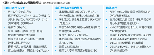 今後訪れたい場所は、日帰り旅行・レジャーでは、テーマパーク、温泉、観光地での散策や食べ歩き、神社仏閣の拝観。宿泊をともなう国内旅行は、北海道、沖縄、京都、東京など国内観光地。海外旅行では、ハワイ、台湾、韓国、イタリア、アメリカ、フランスなどがあがった。<図4>