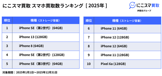 2025年の年間買取数ランキングでは、iPhone SE(第2世代)64GBが1位にランクインしました。