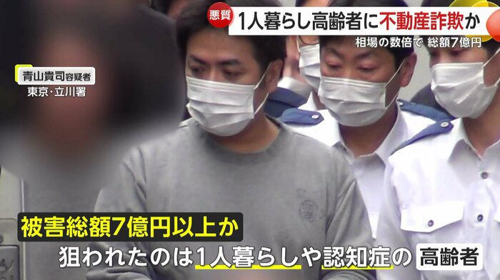 8人の容疑者と共謀し、高齢者に相場の数倍高い価格でマンションを売りつけ、現金をだまし取った疑いが持たれている。