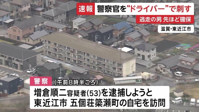 滋賀県東近江市で26日朝、傷害事件の容疑者を逮捕しようとした警察官が、容疑者の男にドライバーのようなもので刺された。