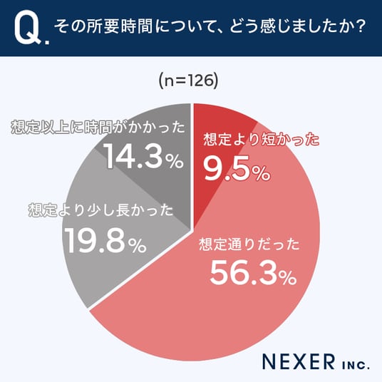 一方で「想定より少し長かった」が19.8%、「想定以上に時間がかかった」が14.3%となり、合計すると34.1%が「想定より長かった」と感じています。「想定より短かった」は9.5%にとどまりました。