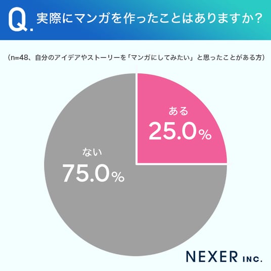 今回の調査では、オリジナルマンガを作ってみたいと思ったことがある方は全体の約1割でした。ただ、そのうち75.0%は、実際には制作まで進めていないことがわかりました。