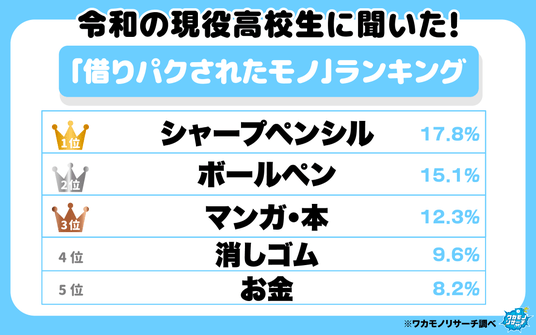 ワカモノリサーチでは、果たして“一番借りパクされるモノは何なのか?”を集計しランキング化したところ、