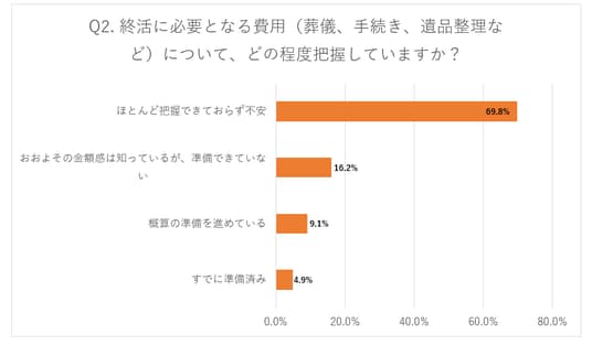 次に本調査では終活にかかる費用の認識についても詳しく尋ねました。「終活に必要となる費用についてどの程度把握しているか」という問いに対して、葬儀費用や遺品整理、死後事務手続きなどの支出は「ほとんど把握できておらず不安」と回答したのが69.8%となっており、「おおよその金額感は知っているが、準備できていない」との回答と合わせると全体の86%が準備不足の状態にあることが分かりました。