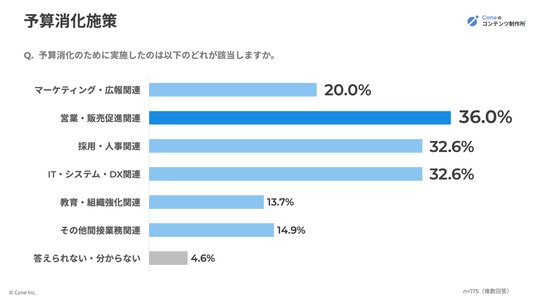 今回の調査で、最も多く予算が活用されていたのが営業・販売促進関連(36.0%)でした。やはり「売上に直結する領域」は、年度末の予算消化においても優先度が高いことが分かります。