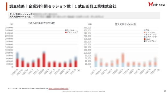 内資/外資主要製薬企業71社を対象としたオウンドメディアの活用状況調査に加え、内資/外資主要製薬企業71社のアクセス調査を実施。アクセスレポートは「総合」「各社詳細」に分け、各社詳細レポートでは、71社のうち19社の年間セッション数や流入経路、ページ別アクセス数比較など、より詳細にレポート化しました。