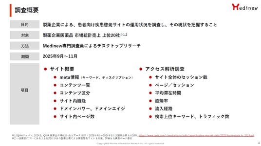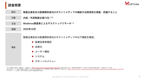 調査目的|製薬企業各社の医療関係者向けオウンドメディアの機能や活用実態および、利用傾向を調査・把握すること