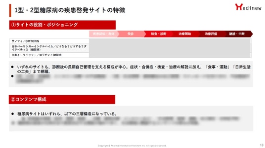 Medinewが選定した9疾患を軸に、製薬企業が運営する患者向け疾患啓発サイトの実施状況を調査。各社が患者に向けてサイト上でどのような情報発信をしているのかや、各サイトのアクセス概要を網羅的に見ることで、疾患啓発サイトのコンテンツ企画やリニューアルなど、施策検討にお役立ていただけます。
