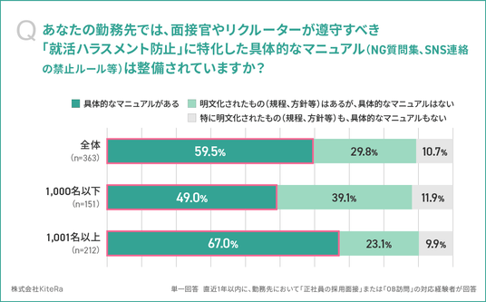 - 企業の59.5%が「就活ハラスメント防止」に特化した具体的なマニュアルを整備(1,001名以上:67.0%、1,000名以下:49.0%)