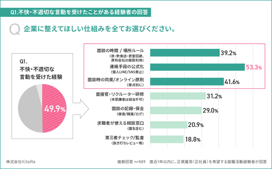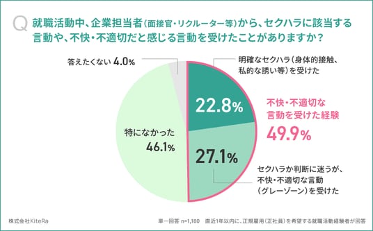 「安心して働ける世界をつくる」をミッションに掲げ、社内規程DXサービスとして企業向け「KiteRa Biz(キテラビズ)」と社労士向け「KiteRa Pro(キテラプロ)」を提供する株式会社KiteRa(代表取締役 執行役員 CEO:植松隆史、本社:東京都港区、読み:キテラ、以下「当社」)は、直近1年以内に正規雇用(正社員)を希望して就職活動を行った求職者1,180名、および直近1年以内に勤務先で「正社員の採用面接」または「OB訪問」の対応経験者363名を対象に、「就活セクハラに関する実態調査」を実施しました。