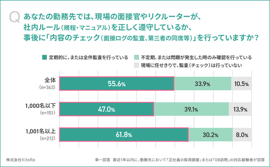 「あなたの勤務先では、現場の面接官やリクルーターが、社内ルール(規程・マニュアル)を正しく遵守しているか、事後に「内容のチェック(面接ログの監査、第三者の同席等)」を行っていますか(単一回答)」と質問したところ、「定期的に、または全件監査を行っている」が55.6%と最多、次いで「不定期、または問題が発生した時のみ確認を行っている」が33.9%、「現場に任せきりで、監査(チェック)は行っていない」が10.5%でした。