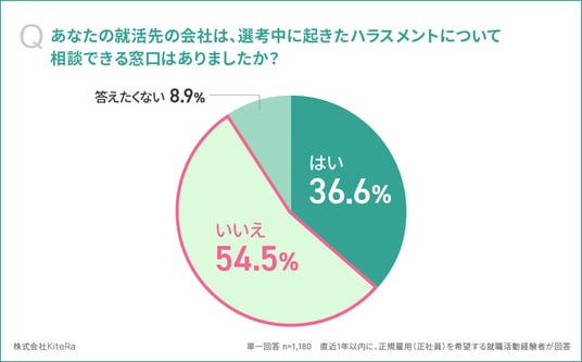 「あなたの就活先の会社は、選考中に起きたハラスメントについて相談できる窓口はありましたか(単一回答)」と質問したところ、「いいえ」が54.5%、「はい」が36.6%、「答えたくない」が8.9%でした。
