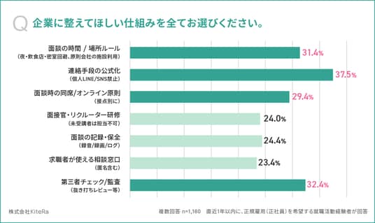 - 求職者が企業に整えてほしい仕組みの上位は、「連絡手段の公式化」37.5%、「第三者チェック/監査」32.4%、「面談の時間/場所ルール」31.4%