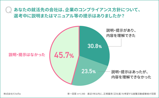 「あなたの就活先の会社は、企業のコンプライアンス方針について、選考中に説明またはマニュアル等の提示はありましたか(単一回答)」と質問したところ、「説明・提示はなかった」が45.7%と最多、次いで「説明・提示があり、内容を理解できた」が30.8%、「説明・提示はあったが、内容を理解できなかった」が23.5%という結果となりました。